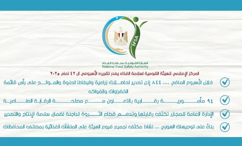 أصدر المركز الإعلامي لليئة القومية لسلامة الغذاء تقريره الأسبوعي الـ 42 لعام 2025، وذلك عن الفترة من 8 – 14 نوفمبر، والذي تضمن العديد من الأنشطة المختلفة على النحو التالي: