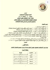 أعلنت  الهيئة الوطنية للانتخابات، الجدول الزمني لانتخابات مجلس النواب داخل الـ 30 دائرة الملغاة بالمرحلة الأولى ، تنفيذًا للأحكام النهائية الصادرة عن المحكمة الإدارية العليا بإلغاء النتائج وإعادة التصويت فيها.