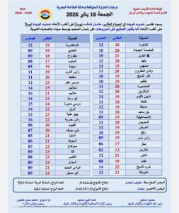 حذّرت الهيئة العامة للأرصاد الجوية – الإدارة العامة للتنبؤات والإنذار المبكر من فرص تكون شبورة مائية كثيفة اعتبارًا من الساعة 2 فجرًا وحتى 10 صباحًا يوم الجمعة 16 يناير 2026، على مناطق من شمال البلاد حتى القاهرة الكبرى وشمال الصعيد ووسط سيناء، وقد تصل إلى حد الضباب بما يؤدي إلى انخفاض الرؤية الأفقية على بعض الطرق.