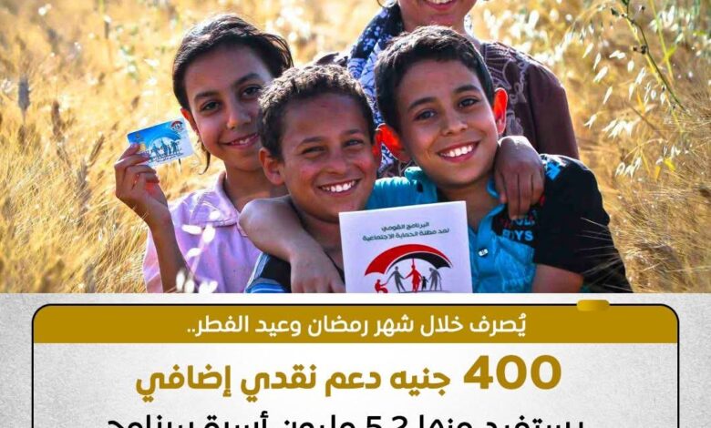 ” المالية ” تعلن صرف 400 جنيه دعمًا إضافيًا لـ5.2 مليون أسرة من “تكافل وكرامة” خلال رمضان وعيد الفطر 2026